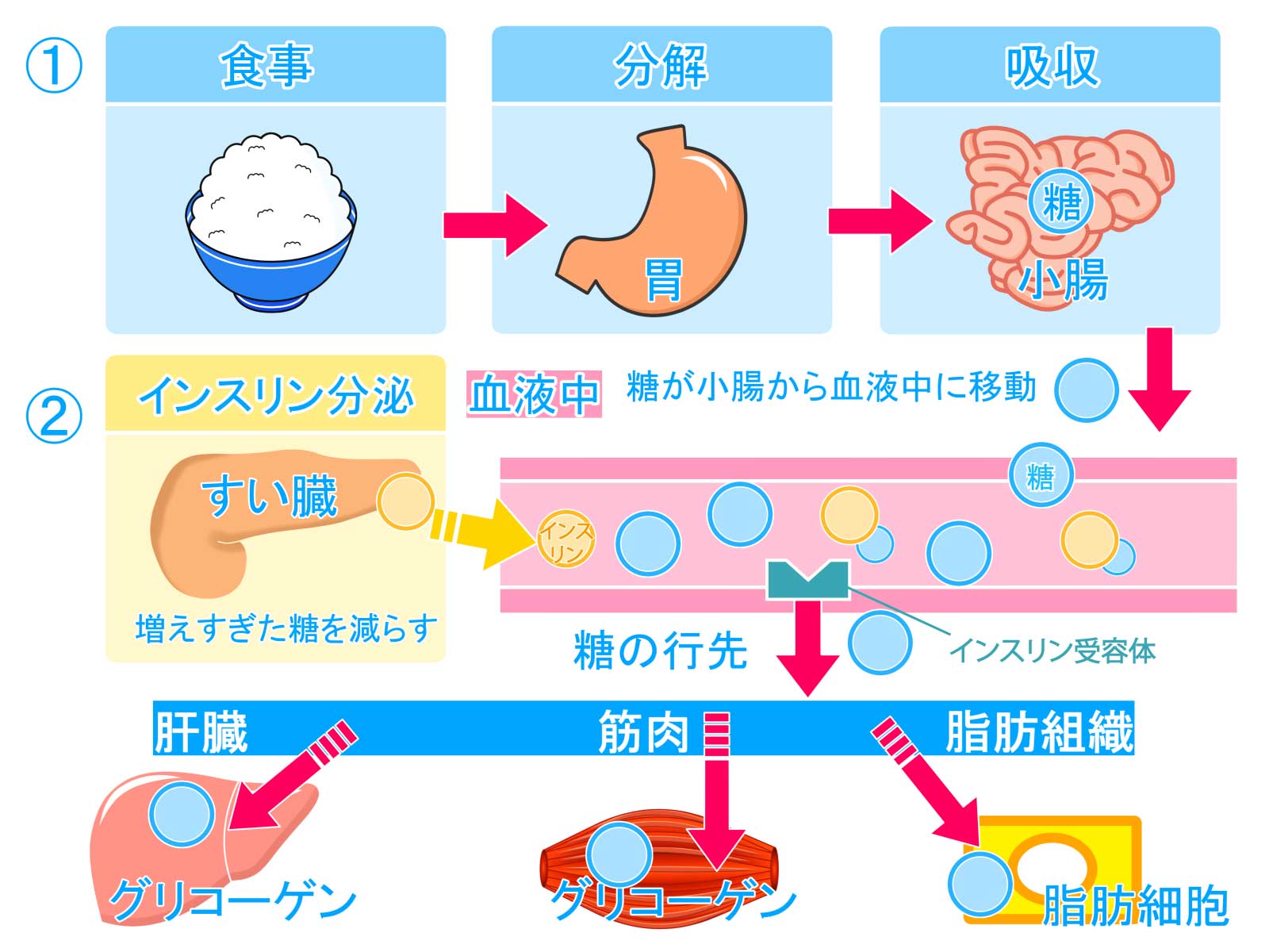 すい臓から分泌されたインスリンは、血液を通じて全身に運ばれ、細胞の表面にあるインスリン受容体と結合。これにより細胞に「糖を取り込め」という信号が伝わり、糖はエネルギーとして利用されるのです。