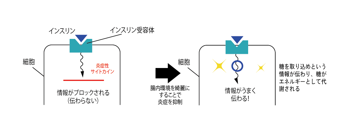 インスリン受容体の良好なコントロールには様々な方法がありますが、その一つに腸内環境があげられます。腸内環境の悪化は全身に微弱な慢性炎症を引き起こし、この炎症が肝臓や筋肉などの細胞にあるインスリン受容体のシグナル伝達を邪魔してしまいます。その結果、インスリンが正常に働けなくなり、血糖値が下がりにくくなってしまうのです。